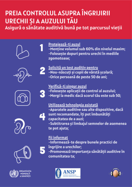 - Modul în care vom auzi depinde de modul în care avem grijă de sănătatea urechii astăzi, deoarece multe cazuri de pierdere a auzului pot fi evitate prin adoptarea unor practici de ascultare sigură și bune de îngrijire a auzului. Pentru cei care trăiesc cu deficiență de auz, identificarea timpurie și accesul la reabilitare în timp util sunt esențiale pentru a-și atinge cel mai înalt potențial.